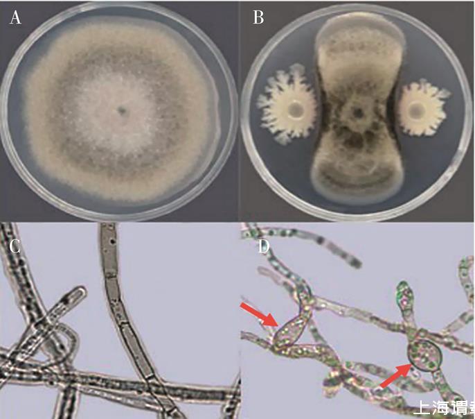A.鏈格孢菌單獨培養(yǎng)B.菌株L249與鏈格孢菌對峙培養(yǎng)C.單獨培養(yǎng)的鏈格孢菌菌絲(100×)D.與L249對峙培養(yǎng)7d后的鏈格孢菌菌絲(100×)