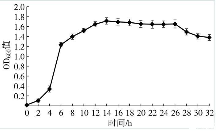 生長速率測定結(jié)果表明(圖3),菌株L249在0~2 h內(nèi)生長較慢,處于延滯期,2~4 h生長逐漸加快,4 h后生長速率劇增,進入對數(shù)生長期,4~6 h生長速率最快,6~14 h菌株生長量持續(xù)增加,14 h后OD600值達到最大。培養(yǎng)16~26 h后菌株生長量基本保持不變,到達穩(wěn)定期,26 h以后開始下降,進入衰亡期。