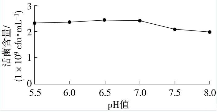 由圖6可知,當pH在5.5~6.5之間,菌株BC80-6的活菌含量隨pH的增大而增大。當pH為6.5時,活菌含量達到最大,為2.44×109 cfu/mL。當pH在6.5~8.0之間,隨著pH的增大,菌株BC80-6的活菌含量明顯下降。因此,培養(yǎng)液的pH應(yīng)控制在6.5左右。