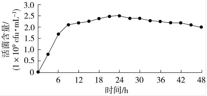 由圖4可知,0~3 h為菌株BC80-6的生長停滯期,活菌含量增長較少。3 h后菌株BC80-6生長較快,活菌含量大幅增加。9~24 h,菌株BC80-6生長穩(wěn)定,活菌含量增長緩慢。24 h活菌含量達到最大,為2.5×109 cfu/mL。24 h后活菌含量開始減少,菌株BC80-6進入生長衰亡期。因此,選用培養(yǎng)9~24 h的菌液為菌種較合適,此時菌株BC80-6在對數(shù)生長末期,既有較高的細胞活力,又可獲得較多的細胞數(shù)。