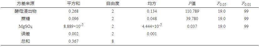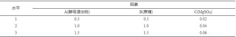 由2.2節(jié)結(jié)果可知,最佳碳源、氮源、無機鹽的種類分別是:蔗糖、酵母浸出物、MgSO4。蔗糖、酵母浸出物、MgSO4各設(shè)3個含量水平,進行正交試驗(表2)。