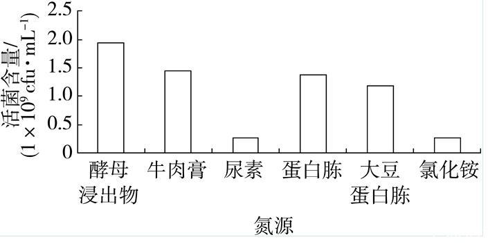 由圖2可知,氮源為有機氮時菌株BC80-6的生長明顯優(yōu)于無機氮。以無機氮(尿素、氯化銨)為氮源,菌株BC80-6的活菌含量較少(<0.28×109 cfu·mL-1),說明菌株BC80-6不能很好地利用這兩種氮源。以有機氮(酵母浸出物、牛肉膏、蛋白胨和大豆蛋白胨)為氮源,菌株BC80-6的活菌含量均高于1.2×109 cfu·mL-1。菌株BC80-6生長的最適氮源是酵母浸出物,活菌含量為1.95×109 cfu·mL-1。