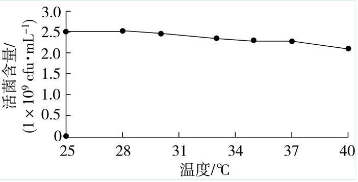 由圖5可知,菌株BC80-6適宜在25~28℃生長。在28℃時,其發(fā)酵液里活菌含量最多,為2.52×109 cfu/mL。因此,28℃是菌株BC80-6的最適培養(yǎng)溫度。