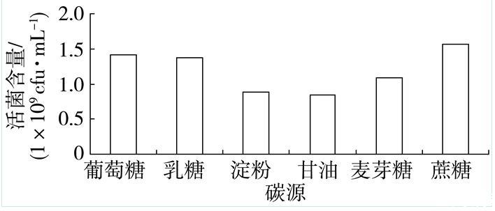 由圖1可知,菌株BC80-6在不同碳源培養(yǎng)基中均可生長。其中,在蔗糖為碳源的培養(yǎng)基中,菌株BC80-6的活菌含量最高,為1.58×109 cfu·mL-1;葡萄糖和乳糖次之,其活菌含量分別為1.42×109和1.39×109 cfu·mL-1。因此,菌株BC80-6生長的最佳碳源是蔗糖,其次是葡萄糖。