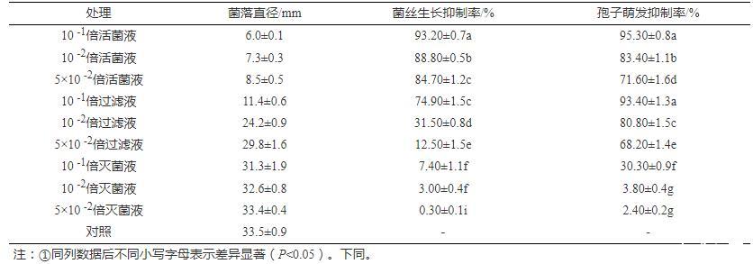 3種枯草芽孢桿菌BC80-6處理液對煙草根黑腐病菌孢子的萌發(fā)均具有抑制作用(表1)。其中,活菌液和過濾液對煙草根黑腐病菌孢子的萌發(fā)均具有較好的抑制作用,10-1倍的活菌液和過濾液對孢子萌發(fā)的抑制率分別為95.3%、93.4%。隨稀釋倍數(shù)的增加,活菌液和過濾液對孢子萌發(fā)的抑制率逐漸降低,且不同稀釋倍數(shù)之間差異顯著。滅菌液的抑制效果最差,10-1、10-2、5×10-2倍的滅菌液對孢子萌發(fā)的抑制率為30.3%、3.8%和2.4%。