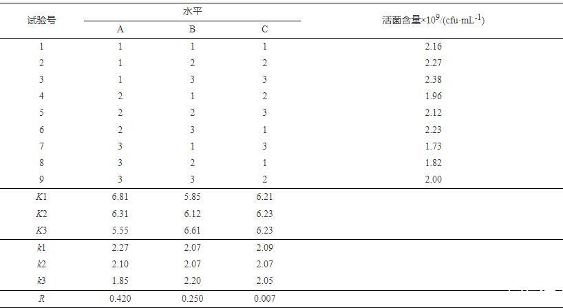 注:①K1、K2、K3分別代表各因素1、2、3水平的3次活菌含量之和;k1、k2、k3分別代表對應(yīng)K的平均值;R代表極差值,即各因素各水平下k值對應(yīng)的最大值與最小值之差。