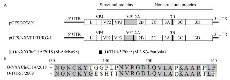 A:重組FMDV基因組質(zhì)粒全長示意圖.B:重組VP1結(jié)構(gòu)蛋白G-H環(huán)氨基酸的比對
