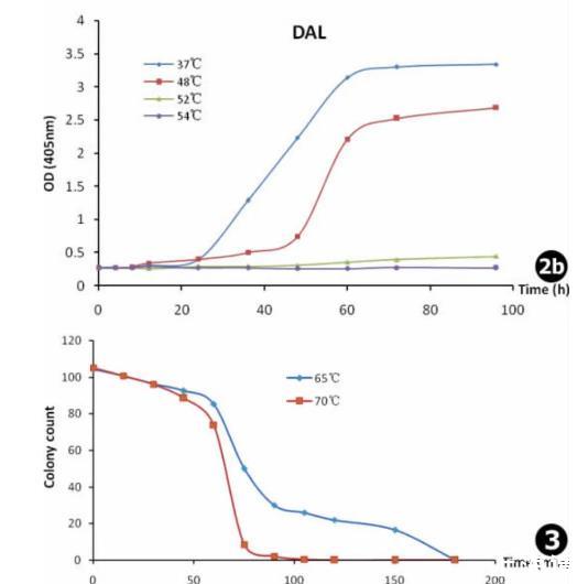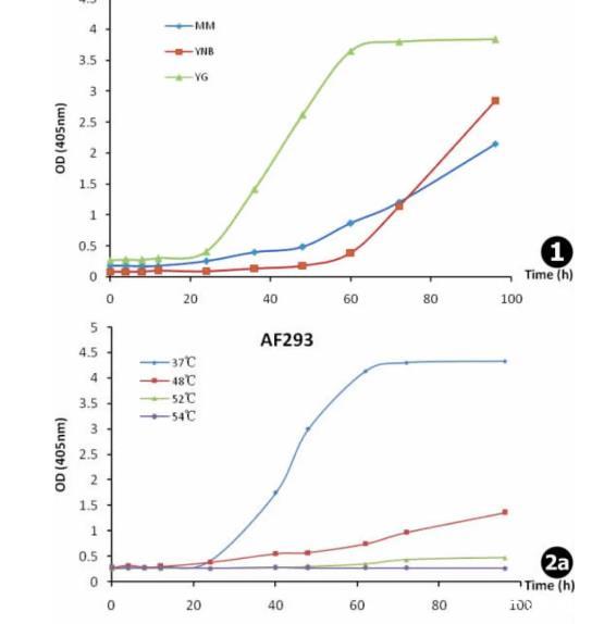 圖1兩株煙曲霉菌株在不同培養(yǎng)基中的生長(zhǎng)曲線(MM.曲霉基礎(chǔ)培養(yǎng)基,YNB.酵母氮源基礎(chǔ)培養(yǎng)基,YG.酵母浸膏培養(yǎng)基)圖2煙曲霉在不同溫度下的生長(zhǎng)曲線:a.AF293,b.DAL圖3兩株煙曲霉菌株在高溫下的活力曲線
