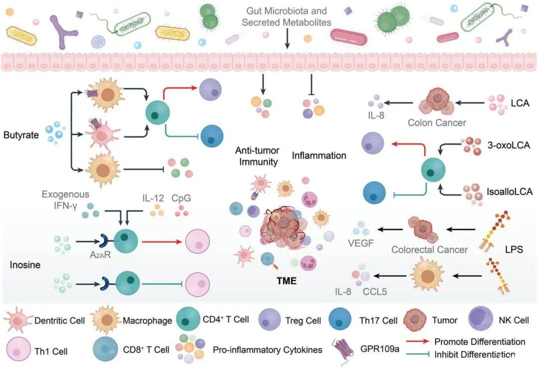 圖1 TME中免疫和炎癥反應(yīng)主要由免疫細(xì)胞和細(xì)胞因子介導(dǎo),微生物代謝產(chǎn)物起重要的調(diào)節(jié)作用