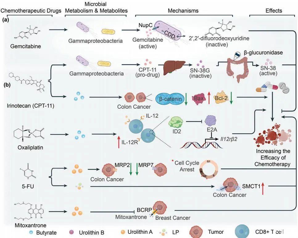 微生物代謝產(chǎn)物也會影響化療的有效性和安全性(圖2)。研究表明,微生物能改變多種化療藥物活性。例如:多種腸道微生物存在β-葡萄糖醛酸酶(GUSB)可將伊立替康代謝為活性產(chǎn)物SN-38,對腸上皮細(xì)胞產(chǎn)生極強的毒副作用,并能增加梭桿菌、變形菌和腸桿菌科的豐度,加重腹瀉和腸道炎癥。因此,殺滅上述腸道微生物對GUSB發(fā)揮靶向抑制作用,是更加安全的治療方案。又如,吉西他濱廣泛運用于胰腺導(dǎo)管癌、膀胱腫瘤和轉(zhuǎn)移性三陰性乳腺腫瘤等惡性腫瘤的治療,伽馬變形菌門能其失活并誘導(dǎo)耐受。聯(lián)用環(huán)丙沙星可以消除對吉西他濱的耐藥作用。再比如,5-氟尿嘧啶(5-FU)可用于治療多種消化道腫瘤。大腸桿菌和具核梭桿菌可將其轉(zhuǎn)化為無活性的二氫氟尿嘧啶,導(dǎo)致耐藥,與較短的無復(fù)發(fā)生存期相關(guān)。