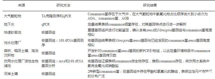 Comammox微生物確認(rèn)存在后,研究者使用comammox微生物amoA基因數(shù)據(jù)在公開數(shù)據(jù)平臺進(jìn)行比對,發(fā)現(xiàn)comammox微生物的amoA基因在土壤(稻田、平原、森林等)、淡水環(huán)境(濕地、河床、湖泊沉積物、蓄水層)均有分布。近來,研究者對自然和人工環(huán)境中comammox菌的生境分布進(jìn)行了廣泛調(diào)研,在新的研究進(jìn)展中證實(shí)了相關(guān)規(guī)律。表1是不完全統(tǒng)計(jì)的目前報(bào)道的comammox微生物分布情況?,F(xiàn)有的comammox菌的分布研究結(jié)果進(jìn)一步驗(yàn)證了comammox菌可在低氨氮濃度和微氧的環(huán)境中生存的特點(diǎn)。值得指出的是,雖然comammox微生物與AOA的基因存在諸多相似,至今未找到comammox微生物存在于海洋環(huán)境中的直接依據(jù)。