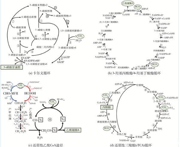 Comammox微生物在碳固定途徑和電子傳遞上的特點(diǎn),使其能夠適應(yīng)低氧的環(huán)境。不同的AOM在碳固定途徑上具有明顯的不同,AOB利用耐氧的卡爾文循環(huán)(Calvin cycle)固定CO2,AOA使用3-羥基丙酸酯/4-羥基丁酸酯循環(huán)固定CO2,anammox菌使用還原性乙酰CoA途徑,而comammox菌固定CO2則通過需氧氣少的還原性三羧酸(rTCA)循環(huán)。圖3中是不同AOM所利用的二氧化碳固定途徑示意圖。除此之外,comammox還有含有一種特殊的細(xì)胞色素bd樣末端氧化酶,對O2的親和力高于其他氨氧化微生物使用的細(xì)胞色素。以上研究結(jié)果表明comammox菌在氧濃度不足的環(huán)境中更具有競爭優(yōu)勢。