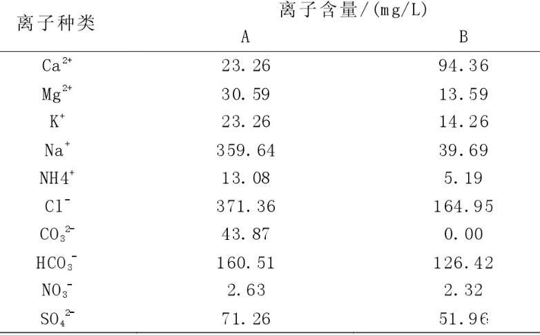 本文根據(jù)現(xiàn)場水質(zhì)取樣測試其離子含量,模擬配制兩種現(xiàn)場水質(zhì),選擇A、B兩種典型水質(zhì)條件,以蒸餾水(下文以O(shè)表示)為基準(zhǔn)實驗對象,研究細(xì)菌的生長曲線變化。其A和B液離子含量檢測結(jié)果如表1所示。