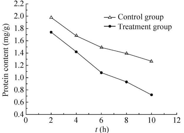 納米銀處理組和對照組的可溶性蛋白含量均呈現(xiàn)降低的趨勢。處理組蛋白含量隨著時間的延長不斷降低,在10 h出現(xiàn)最低值,為1.27 mg/g,是對照組的56.69%。對照組蛋白含量在開始時也出現(xiàn)降低的情況,但始終高于處理組,且降低速率低于處理組(圖7)。