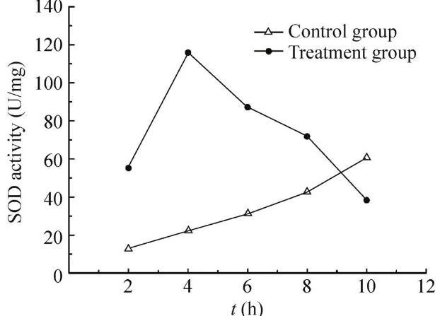 處理組MDA含量呈現(xiàn)先升高后降低的趨勢,在6 h時,迅速上升至最高值1.40 nmol/g,為對照組的2.41倍,6 h后開始出現(xiàn)下降趨勢,10 h降至最低,為對照組的1.05倍。對照組在2?10 h,呈現(xiàn)平緩的上升趨勢,10 h出現(xiàn)最大值,但始終低于處理組(圖5)。