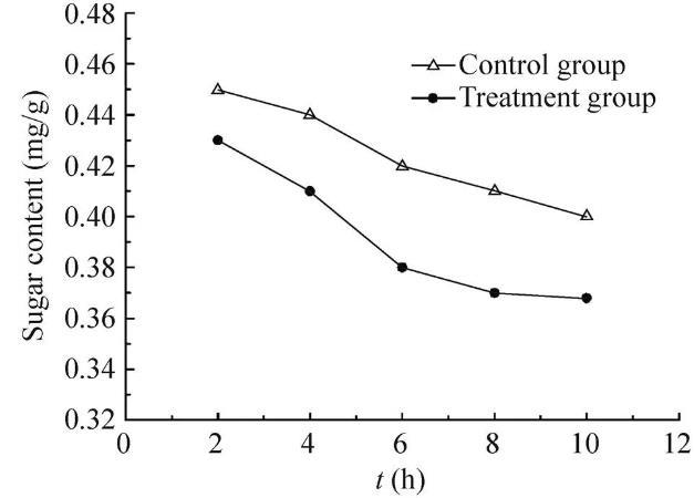 納米銀各處理組和對照組的可溶性糖含量及可溶性蛋白含量呈現(xiàn)同樣的降低現(xiàn)象。處理組糖含量隨著時間的增加不斷降低,6 h到10 h下降緩慢,在10 h出現(xiàn)最低值,為0.40 mg/g,是對照組的92%。對照組在整個實(shí)驗(yàn)過程中與處理組趨勢接近,但含量始終高于處理組(圖8)。
