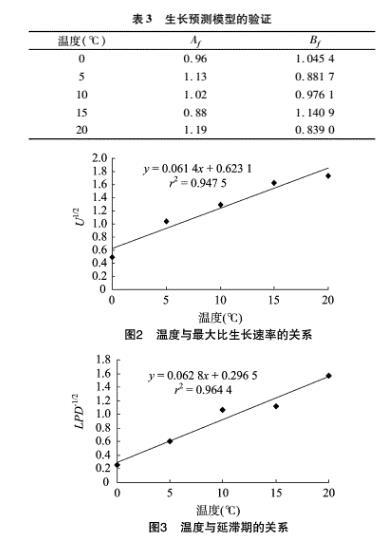 2.2.2一級模型的驗證用Af、Bf來驗證所建一級模型的準(zhǔn)確性。Bf是衡量模型的重要參數(shù),若其值為0.70~1.15,則該預(yù)測模型可以被接受,反之則說明預(yù)測模型是失敗的。由表3可知,模型的Af值均在1左右,Bf值均在0.70~1.15,說明該預(yù)測模型可以有效地預(yù)測0~20℃條件下草魚脊肉塊中熱殺索絲菌的生長。