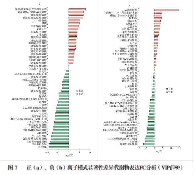 OPLS-DA模型得到的變量權重值(VIP)表示變量投影重要度,值越大,表示越重要。本實驗以VIP>1和P<0.05為顯著性差異代謝物的篩選標準,正離子模式下篩選到670種顯著性差異代謝物,負離子模式下篩選到232種顯著性差異代謝物,由于篩選到的差異代謝物過多,且表格無法直觀地顯示這些代謝物的FC,因此,選擇VIP值前50的差異代謝物,以柱狀圖形式展示鑒定到的顯著性差異代謝物的FC變化,結果如圖7所示??梢钥闯?,與硫乙醇酸鹽液體培養(yǎng)基相比,Akk在優(yōu)化培養(yǎng)基中發(fā)酵后,正離子模式下22種代謝產物顯著上調,28種代謝產物顯著下調,負離子模式下顯著上調代謝產物22種,顯著下調代謝產物28種。后續(xù)將對這些顯著性差異代謝產物進行分析。