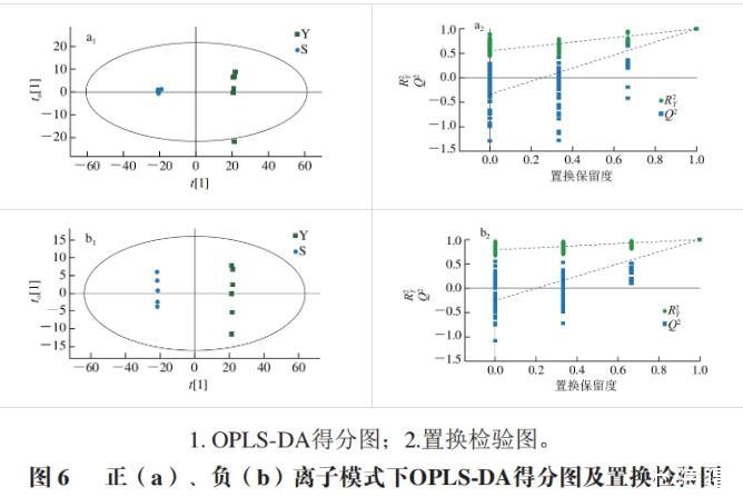 OPLS-DA得分圖及OPLS-DA置換檢驗如圖6所示,t能最大程度反映組間差異,而to則反映組內變異??梢钥闯鯫PLS-DA模型可顯著區(qū)分兩組樣本,且組內差異較小,結果與PCA模型一致。經7次循環(huán)交互驗證得到模型評價參數R2Y、Q2,通常情況下Q2>0.5即表明模型穩(wěn)定可靠。該模型正、負離子模式下的Q2分別為0.998、0.999,均大于0.5。在置換檢驗中,隨著置換保留度逐漸下降,隨機模型的R2和Q2均逐漸下降,說明原模型不存在過擬合現象,模型穩(wěn)定性良好。