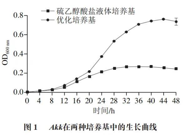 由于Akk在硫乙醇酸鹽液體培養(yǎng)基中生長其菌液密度極低(生長速度慢且活菌數較少),因此本課題組前期在硫乙醇酸鹽液體培養(yǎng)基的基礎上,對Akk培養(yǎng)基進行優(yōu)化。為確定Akk在兩種培養(yǎng)基中的生長穩(wěn)定期以制備發(fā)酵上清液樣本,并對比Akk在兩種培養(yǎng)基中的生長情況,通過測定菌液OD600 nm并繪制生長曲線,結果如圖1所示。