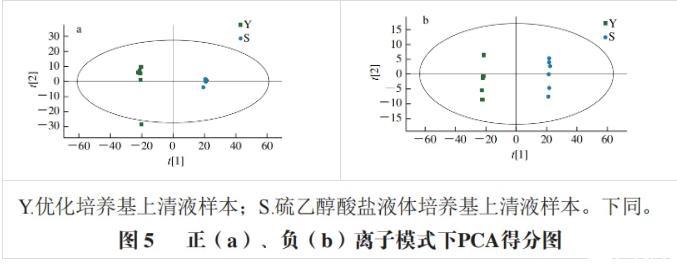 本研究結合單變量統(tǒng)計分析和多維統(tǒng)計分析方法,篩選Akk在兩種培養(yǎng)基中的顯著性差異代謝物,對正、負離子模式下檢測到的顯著性差異代謝物進行分析。
