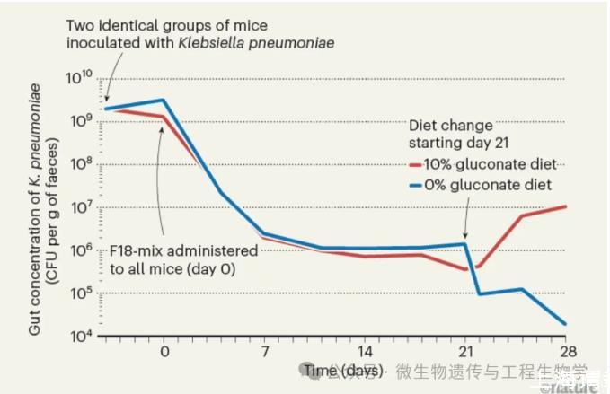 Furuichi等評(píng)估了小鼠糞便中的碳水化合物水平,在缺乏腸道微生物的小鼠中葡萄糖酸鹽濃度很高,但在含有F18-mix的小鼠中葡萄糖酸鹽濃度顯著降低,說(shuō)明F18-mix具有降低葡萄糖酸鹽濃度的作用。除此之外,在食物中添加葡萄糖酸鹽可以逆轉(zhuǎn)F18-mix帶來(lái)的定植抗性(圖1)。
