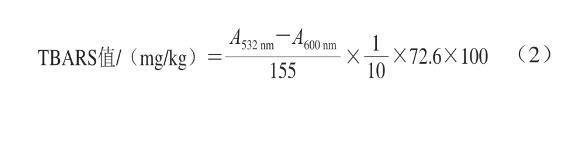 將魚(yú)肉研碎后,稱取10 g樣品放入錐形瓶中,再加入50 mL含0.1 g/100 mL乙二胺四乙酸的7.5 g/100 mL三氯乙酸溶液,置于加熱至70℃的振蕩器中振蕩30 min,取出靜置冷卻后過(guò)濾,取上清液5 mL加入0.02 mol/L TBA溶液,在90℃的水浴鍋中加熱45 min,取出靜置冷卻至室溫后,加入5 mL氯仿,充分混勻,靜置至溶液分層。分別在532 nm和600 nm波長(zhǎng)處測(cè)定上清液吸光度。TBARS值按式(2)計(jì)算: