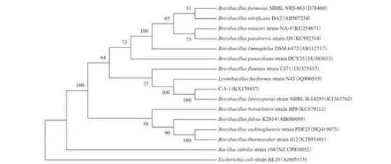 通過(guò)表2所得的16項(xiàng)生理生化試驗(yàn)結(jié)果,結(jié)合形態(tài)學(xué)特征,依據(jù)《伯杰氏細(xì)菌系統(tǒng)鑒定手冊(cè)》,判斷該菌株可能是側(cè)孢短芽孢桿菌(Brevibacillus laterosporus)。