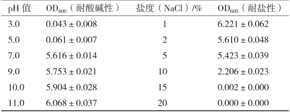 分別測(cè)定細(xì)菌在不同酸堿度和鹽度的生長(zhǎng)特性,從而為該菌株的進(jìn)一步培養(yǎng)和發(fā)酵利用提供依據(jù)。結(jié)果(表4)顯示,側(cè)孢短芽孢桿菌C-5-1在低pH環(huán)境中耐受性有限,在pH≤5.0時(shí)幾乎沒有生長(zhǎng),但在pH≥7.0時(shí)生長(zhǎng)良好,并且隨著pH值的升高,菌體量也一直在增加,這說(shuō)明該菌株耐堿不耐酸。菌株C-5-1在NaCl鹽度≤5%(相當(dāng)于50 g/L)時(shí)正常生長(zhǎng),但隨著鹽度的增加該菌株的生長(zhǎng)受到了一定的抑制,當(dāng)鹽度≥15%時(shí),其生長(zhǎng)受到了完全抑制甚至死亡。這是因?yàn)椴煌}度能形成不同滲透壓環(huán)境,造成細(xì)胞不同程度的脫水,從而降低生長(zhǎng)速率,甚至失活。