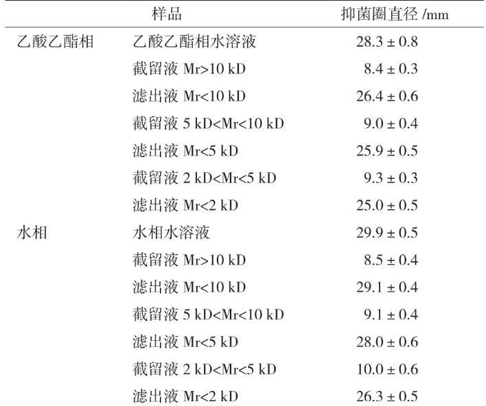 由表5可知,側(cè)孢短芽孢桿菌C-5-1發(fā)酵液的乙酸乙酯相和水相都有明顯的抑菌圈,直徑分別為(28.3±0.8)mm和(29.9±0.5)mm,指示菌為銅綠假單胞菌,這說(shuō)明該菌株不止產(chǎn)生一種抗菌物質(zhì)。后又通過(guò)超濾離心管對(duì)二者進(jìn)行了純化,研究表明這兩種抗菌代謝產(chǎn)物的分子量均小于2 000。