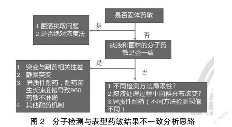 ②檢測技術(shù)的局限性。Xpert MTB/RIF、基因芯片快速分子檢測可檢測到結(jié)核分枝桿菌的核酸,但無法區(qū)別活菌還是死菌;本研究發(fā)現(xiàn)其中1例分子檢測敏感,表型藥敏顯示耐藥,原因是操作過程中標(biāo)本處理不充分,氫氧化鈉時間過長,消化過程中發(fā)生了結(jié)核分枝桿菌核酸(RNA)降解。1例肺泡灌洗液Xpert MTB/RIF檢測陽性,表型培養(yǎng)陰性,查找原因發(fā)現(xiàn)支氣管鏡檢查消毒清洗不徹底有死菌殘留存在,而Xpert MTB/RIF檢測DNA敏感度高所致。另外,還需分析在檢測過程中是否存在分子檢測系統(tǒng)的故障、溫度的錯誤、試劑盒儲存不合理等因素。表型固體培養(yǎng)存在絕對濃度法偏差較大、選取菌落時操作不當(dāng)?shù)纫蛩?。液體960自動培養(yǎng)時吡嗪酰胺(PZA)藥敏菌株過量,在代謝過程產(chǎn)生大量氨類物質(zhì),從而使整個液體培養(yǎng)環(huán)境的pH值升高,導(dǎo)致PZA失去殺菌能力而造成假陽性結(jié)果。可能導(dǎo)致其藥敏試驗(yàn)結(jié)果重復(fù)性差,造成PZA分子與表型藥敏結(jié)果不一致。