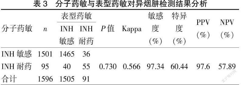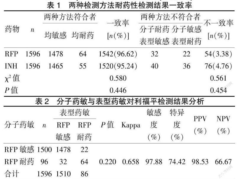 2.1.1兩種檢測方法耐藥性檢測結(jié)果一致率1750例標(biāo)本按流程操作共檢測到結(jié)核分枝桿菌菌株1596例,陽性率為91.20%,非結(jié)核分枝桿菌(NTM)154例(8.80%)。其中快速分子DST檢測出利福平(RFP)耐藥菌株98例,耐藥率為6.14%(98/1596),表型DST藥敏檢測出利福平(RFP)耐藥菌株88例,耐藥率為5.51%(88/1596);兩種方法均檢出利福平(RFP)敏感1478例,均耐藥64例,共1542例利福平(RFP)檢測結(jié)果一致,一致率為96.62%??焖俜肿覦ST檢測出異煙肼(INH)耐藥95例,耐藥率為5.95%(95/1596),表型DST藥敏檢測出異煙肼(INH)91例,耐藥率為5.70%(91/1596),兩種方法異煙肼(INH)均敏感1465例,均耐藥55例,共1520例異煙肼(INH)分子DST檢測與表型DST藥敏檢測結(jié)果一致,一致率為95.24%。見表1。兩種方法共檢測出耐多藥肺結(jié)核(MDR-TB)患者34例,耐多藥率為2.13%(34/1596)。