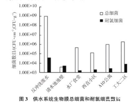 圖3供水系統(tǒng)生物膜總細(xì)菌和耐氯細(xì)菌數(shù)目