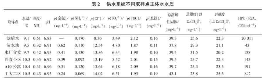 表2供水系統(tǒng)不同取樣點(diǎn)主體水水質(zhì)