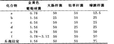 藥物倍比稀釋,作用于實(shí)驗(yàn)菌液24h后。測定藥物的MIC(表2).由表可知。該類衍生物對金葡菌的MIC≤6.56vg/mL,表明金葡菌對化合物敏感。其中衍生物a。e。f尤為明顯;對其他3種實(shí)驗(yàn)菌的MIC為25~50~g/mL。證實(shí)化合物對4種菌液均有抑制作用,但對G作用明顯強(qiáng)于G一,表現(xiàn)為對金葡菌選擇性更強(qiáng)。