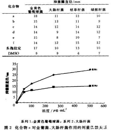 將菌體稀釋。均勻涂布于瓊脂平板上。每個(gè)管碟中加受試藥物200 L,設(shè)3組平行。37C作用24h后測量抑菌圈直徑(表1)。由表可知。6種衍生物對實(shí)驗(yàn)菌株均有不同程度的抑制活性。對金葡菌抑制活性最強(qiáng),且呈劑量依賴關(guān)系(圖2)。