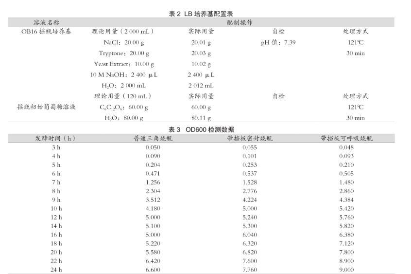 按表2配制Luria-Bertan(LB)培養(yǎng)基,三個搖瓶在工作過程,培養(yǎng)基中含氧量順序為:帶擋板可呼吸搖瓶>帶檔板不可呼吸、普通搖瓶。