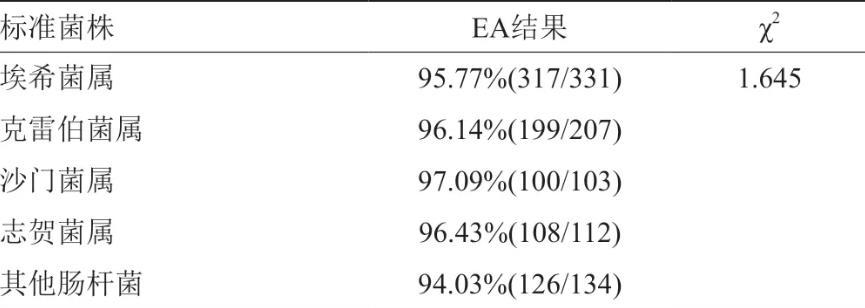 針對887株腸桿菌科細菌按照不同種屬分類,計算其EA一致性,埃希菌屬的EA為95.77%(317/331),克雷伯菌屬的EA為96.14%(199/207),沙門菌屬的EA為97.09%(100/103),志賀菌屬的EA為96.43%(108/112),其他屬腸桿菌的EA為94.03%(126/134),并對這5種進行顯著性差異分析,結果見表4所示。