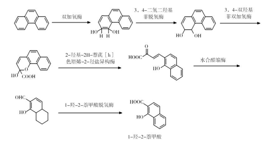以假單胞菌屬為例:1-羥基-2-萘甲酸經(jīng)1-羥基-2-萘甲醛羥化酶轉(zhuǎn)化為1,2-二羥萘,1,2-二羥萘在1,2-二羥萘雙加氧酶作用下生成2-羥-2H-苯并吡喃-2-羧酸后,經(jīng)過2-羥-2氫-苯并吡喃-2-羧基異構(gòu)酶、順-o-羥基苯脫萘丙酮酸水合-醛縮酶及水楊醛脫氫酶催化作用下生成水楊酸,水楊酸被水楊酸羥化酶、鄰苯二酚-1,2-雙加氧酶轉(zhuǎn)化成琥珀酸和乙酰輔酶A最終進入三羧酸循環(huán)。