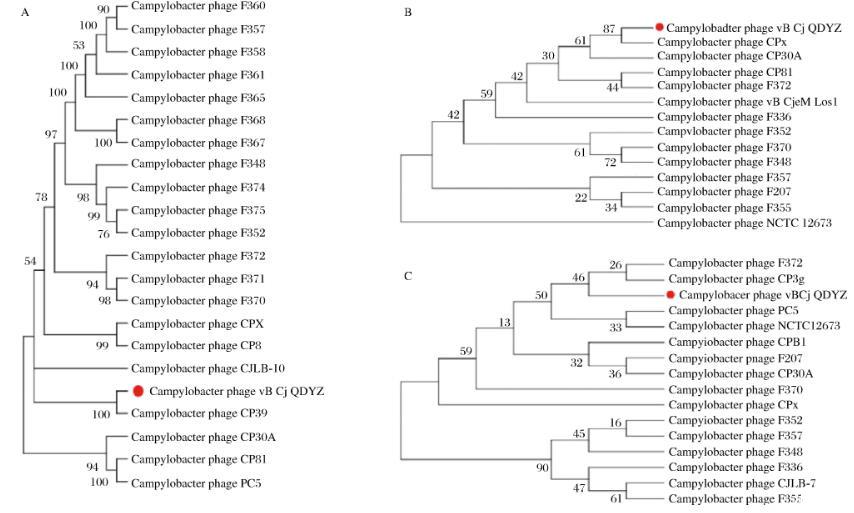 如圖4-B所示,噬菌體vB_Cj_QDYZ的內(nèi)溶素和CampylobacterphageCPX的內(nèi)溶素相似度最高;如圖4-C所示,vB_Cj_QDYZ的主要衣殼蛋白與CampylobacterphageCP39的最相近。標(biāo)尺代表遺傳距離,遺傳距離越短代表親緣關(guān)系越近。明顯看出,圖4-B和圖4-C的進(jìn)化樹(shù)標(biāo)尺較長(zhǎng),遺傳距離較大。因此推斷噬菌體vB_Cj_QDYZ可能為一株新的空腸彎曲菌噬菌體。