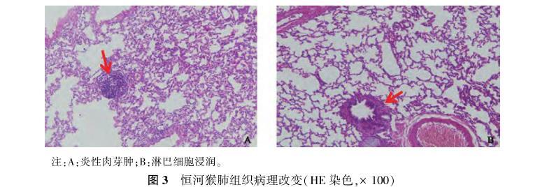 圖3恒河猴肺組織病理改變(HE染色,×100)