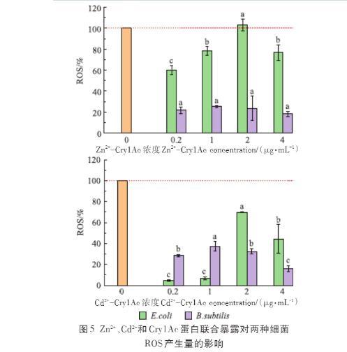 細(xì)菌處于Zn2+、Cd2+和Cry1Ac蛋白聯(lián)合暴露的條件下時,隨著濃度增加兩種菌體ROS的產(chǎn)生量整體呈現(xiàn)先上升后降低趨勢(圖5),各處理組細(xì)菌ROS產(chǎn)生量都低于對照組(除了濃度為2μg?mL-1的Zn2+-Cry1Ac復(fù)合體對E.coli的ROS產(chǎn)生量為103.1%)。如圖5所示,聯(lián)合暴露下E.coli和B.subtilis的ROS產(chǎn)生量呈顯著性變化(P<0.05),這與單獨(dú)金屬離子暴露下細(xì)菌ROS產(chǎn)生量呈現(xiàn)的趨勢不同,是與金屬離子與色氨酸的吲哚基團(tuán)之間的N配位有關(guān)。在Zn2+-Cry1Ac和Cd2+-Cry1Ac體系中,Zn2+和Cd2+對吲哚基團(tuán)(色氨酸)中的N具有很強(qiáng)的結(jié)合能力,導(dǎo)致其對細(xì)菌的氧化損傷降低,從而進(jìn)一步降低金屬毒性。Zn2+-Cry1Ac處理比Cd2+-Cry1Ac處理下E.coli體內(nèi)ROS產(chǎn)生量多:一方面,Cd2+會誘導(dǎo)細(xì)菌防御機(jī)制響應(yīng)誘導(dǎo)谷胱甘肽過氧化物酶(GSH-Px)、谷胱甘肽-S-轉(zhuǎn)移酶(GST)和金屬硫蛋白(MT)等幾種保護(hù)酶的升高,這些酶能夠拮抗Cd的毒性,更多的抗氧化酶能夠清除生物體中Cd脅迫產(chǎn)生的超氧陰離子和過氧化氫等。另一方面,用純Cd2+溶液(如CdCl2)進(jìn)行培養(yǎng)時,其對細(xì)菌的毒性大于Zn2+溶液。Cd2+-Cry1Ac較Zn2+-Cry1A對細(xì)菌的毒性低,這是因?yàn)镃d2+與其他物質(zhì)(例如各種離子或有機(jī)成分)之間的相互作用通常會改變Cd2+的毒性,此時Zn2+-Cry1A聯(lián)合暴露對細(xì)菌毒性更強(qiáng)。