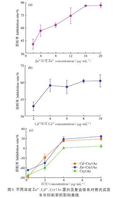 圖6不同濃度Zn2+、Cd2+、Cry1Ac蛋白及復(fù)合體系對費(fèi)氏弧菌生長抑制率的影響曲線
