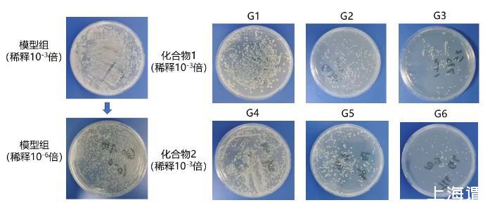 與對(duì)照組相比,化合物1和化合物2均能顯著降低鮑曼不動(dòng)桿菌感染后小鼠肺部的細(xì)菌載量(P<0.05),且這種治療效果具有劑量依賴效應(yīng)。在不同劑量的化合物1和化合物2中,高劑量化合物2(G6)的治療效果最好(P<0.01)。