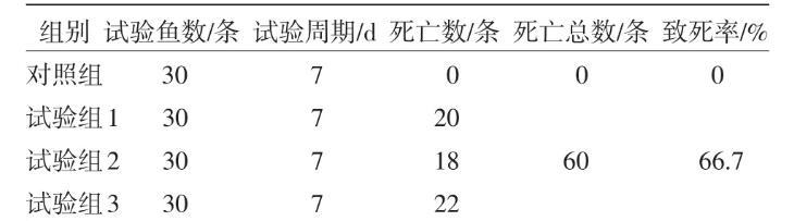 試驗(yàn)魚選用當(dāng)年的鯽魚,購(gòu)自吉林省金龍漁場(chǎng)。馴化7 d,選取體格健壯、規(guī)格整齊、游動(dòng)活躍平均初體重為(98±0.01)g的鯽魚120尾,隨機(jī)分為4組,1組對(duì)照組,其余3組為試驗(yàn)組。將4組魚同時(shí)放入相同水環(huán)境不同魚缸中(魚缸規(guī)格80 cm×60 cm×100 cm)。對(duì)照組每條魚注射無(wú)菌液體LB培養(yǎng)基0.5 mL,試驗(yàn)組每條魚注射30℃,培養(yǎng)6 h的含致病菌的液體LB 0.5 mL。27℃水溫下飼養(yǎng)7 d,觀察,并記錄[7-8]。從死亡的病灶部位進(jìn)行病原菌的再分離及鑒定。