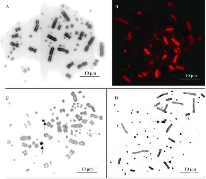染色體數(shù)目和形態(tài)鳥(niǎo)類(lèi)染色體所具有的大量微小染色體在使用Giemsa染液染色時(shí)著色較淺(圖4A),在染色體分散不理想時(shí)不易計(jì)數(shù)。為了準(zhǔn)確計(jì)數(shù)微小染色體,我們采用能使所有鳥(niǎo)類(lèi)染色體均勻著色的熒光染料碘化丙啶(propidium iodine,PI,Amresco)對(duì)所制備的中期染色體進(jìn)行染色(圖4B)。對(duì)100個(gè)中期分裂相的計(jì)數(shù)結(jié)果表明,細(xì)胞的染色體眾數(shù)為2n=68,包括性染色體在內(nèi)有10對(duì)大染色體,其余為微小染色體。我們的結(jié)果與Liu et al(1992)報(bào)道的朱鹮核型分析結(jié)果一致,證明我們所建立的細(xì)胞系確實(shí)來(lái)源于朱鹮。