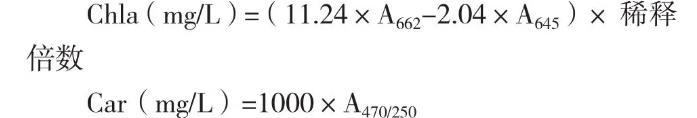 1.2.7脂溶性光合色素測定取10 mg藻粉,置于10 mL玻璃離心管中,加入5 mL丙酮,避光冰浴攪拌提取1-2 d,直至藻體變白,3 000 r/min離心10 min收集上清得到色素提取液。采用分光光度法在662 nm、645 nm和470 nm下測定葉綠素a、總類胡蘿卜素含量[27-28],由下列公式計算: