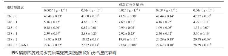 表3磷源濃度對(duì)海水鈍頂螺旋藻脂肪酸相對(duì)百分含量的影響