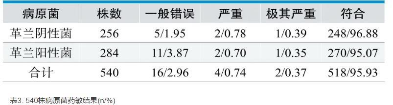 革蘭陰性菌藥敏結(jié)果相符248株,符合率為96.88%。革蘭陽性菌藥敏結(jié)果相符270株,符合率為95.07%??傮w相符518株,符合率為95.93%,具體情況見表3。