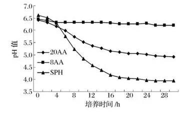 與MRS和脫脂乳培養(yǎng)基相比還相差很多,說明全價氨基酸并不能為保加利亞乳桿菌菌株獲得最適生長氮源。用分子量小于5 ku的SPH替代氨基酸作為氮源使保加利亞乳桿菌的生長狀況大為改觀,最大生長速率是20種氨基酸的5倍,pH值可下降到pH4.0以下。由此說明大豆蛋白水解物是保加利亞乳桿菌生長的最佳氮源,可獲得相對較大的生長量。